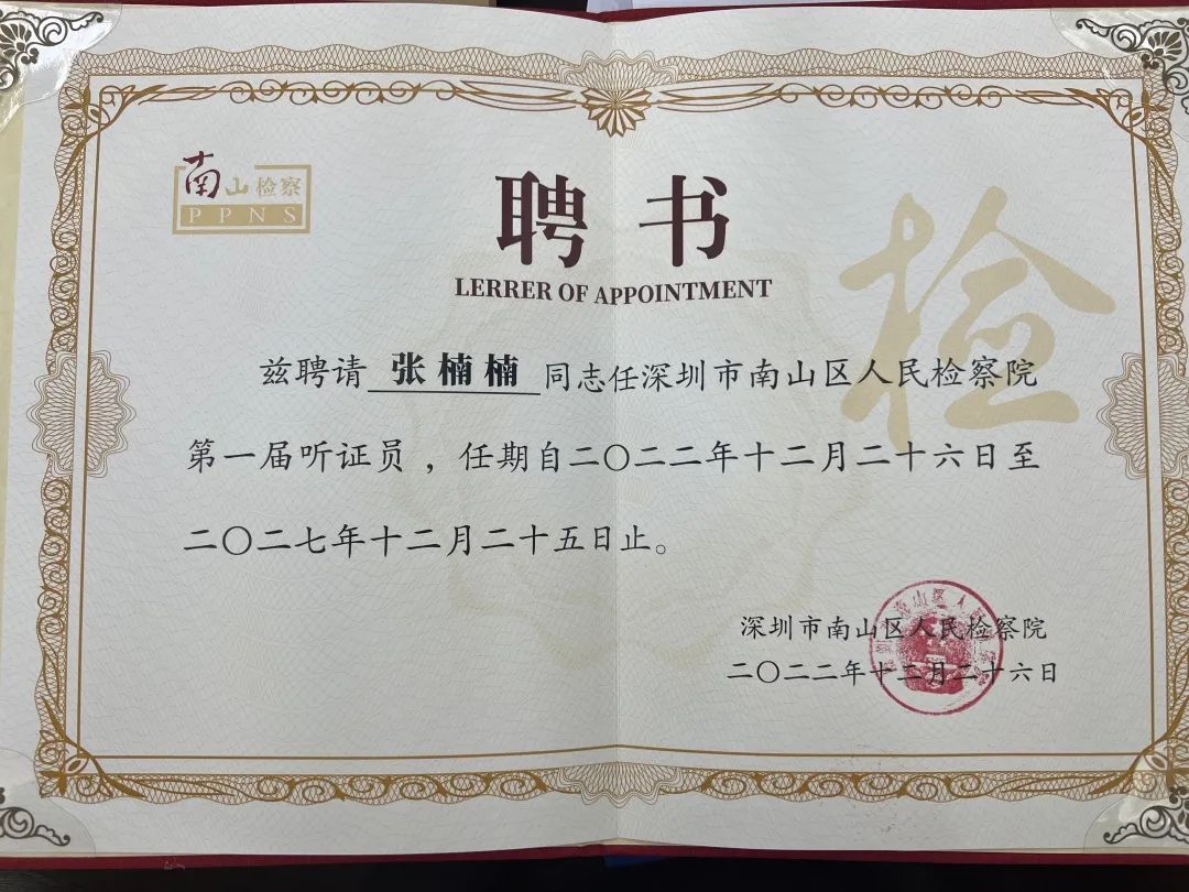 喜报|张楠楠律师被聘为深圳市南山区检察院首批听证员!