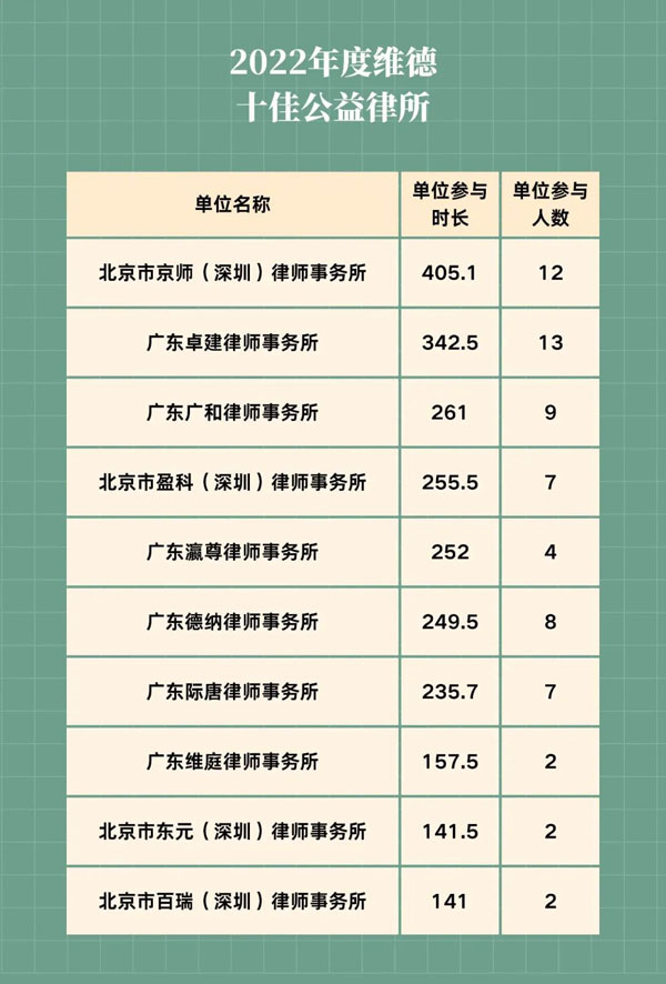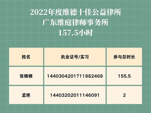 张楠楠律师荣获2022年度“维德十佳公益律师”称号,2022年志愿服务时长长达155.5小时。