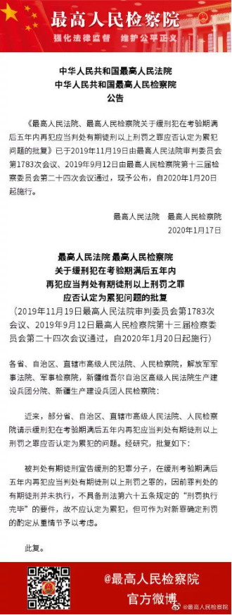 今天,最高人民检察院官方微博公布了《最高人民法院、最高人民检察院关于缓刑犯在考验期满后五年内再犯应当判处有期徒刑以上刑罚之罪应否认定为累犯问题的批复》。