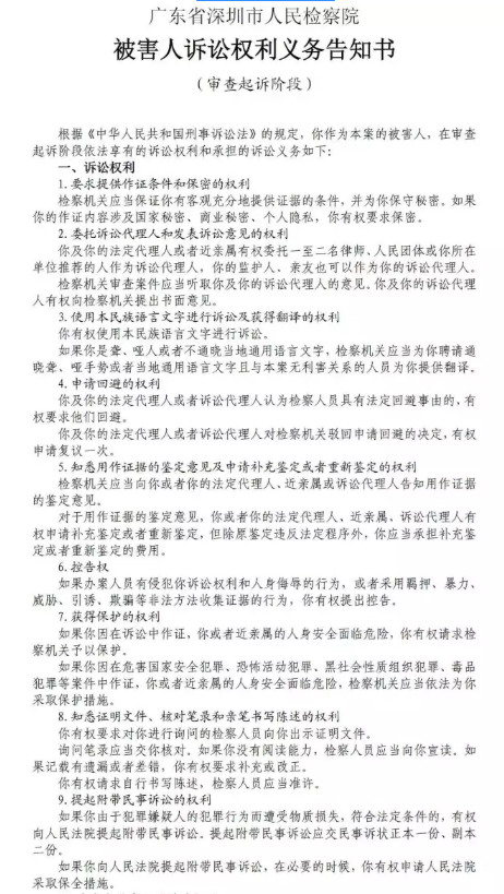 因本案被害人人数众多,根据《中华人民共和国刑事诉讼法》的有关规定,经本院联系,仍有部分被害人无法送达,现采取公告方式告知本案被害人在审查起诉阶段享有的权利义务,详见《广东省深圳市人民检察院被害人诉讼权利义务告知书(审查起诉阶段)》。