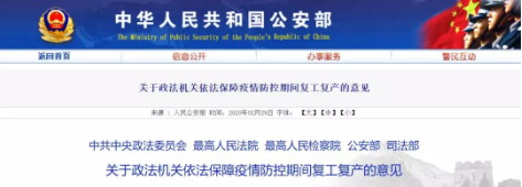 2020年2月29日,中共中央政法委员会、最高人民法院、最高人民检察院、公安部 司法部发布《关于政法机关依法保障疫情防控期间复工复产的意见》