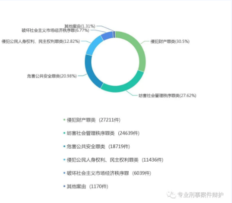 从上图可以看出,数量排前三的犯罪类型分别是侵犯财产罪类、妨害社会管理秩序罪类、危害公共安全罪类,总占比79.1%。