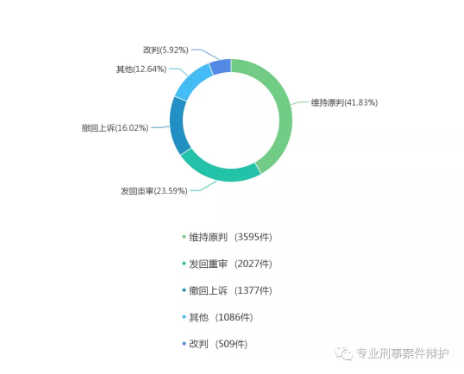 从上图可以看出,二审维持原判的刑事案例,占比41.83%;发回重审的,占比23.59%;而直接改判的,只有5.92%。