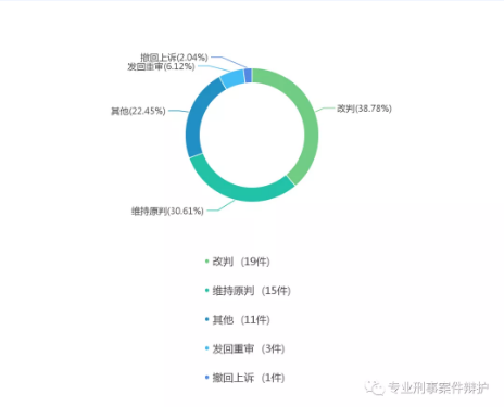 从上图可以看出,再审改判的刑事案例,占比为38.78%,比例最高。