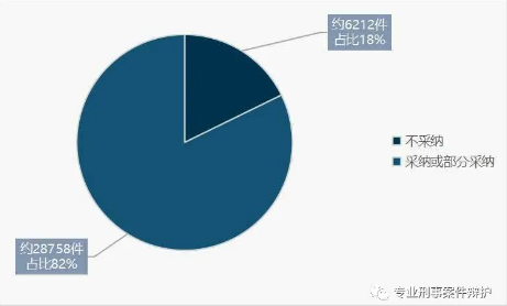 从上图可以看出,2019年广东刑事案例中,采纳或者部分采纳律师辩护意见的,占比82%。