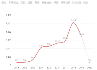 在非法制造、买卖、运输、邮寄、储存枪支、弹药、爆炸物罪名中,自2011年至2018年的判决发生率不断上升,而自2018年后,在国家不遗余力的管制下则呈下降趋势。以刑事案件的进展流程来看,案件自公安阶段立案侦查到法院审判阶段,差不多需要近十一个月的时间,那么可以大概推论出在2017年间,此类案件的案发率最高。