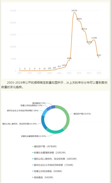 2003-2019年公开的假释裁定数量如图所示,从上方的年份分布可以看到案例数量的变化趋势。